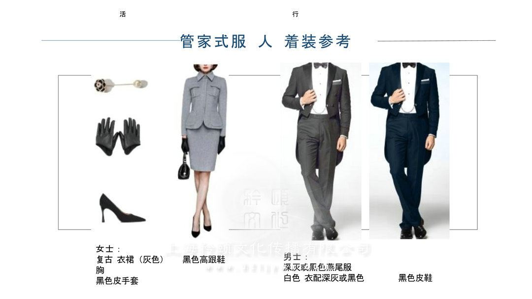 禮儀人員的著裝要求:、參考禮儀服裝推薦、儀表整潔、頭發和指甲修剪整齊,頭發挽成發髻或盤起、不允許抹指甲油、粘假睫毛或帶美瞳隱形眼鏡、不允許戴首飾、裸露部位無紋身。