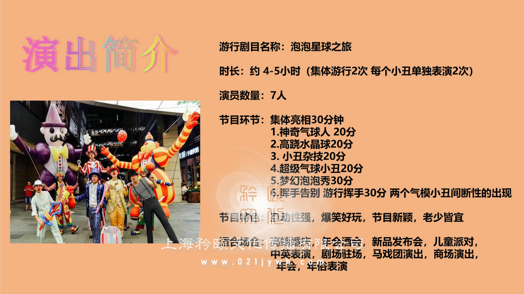 適合場合:高端婚慶,年會酒會,新品發布會,兒童派對,中英表演,劇場駐場,馬戲團演出,商場演出,年會,年俗表演