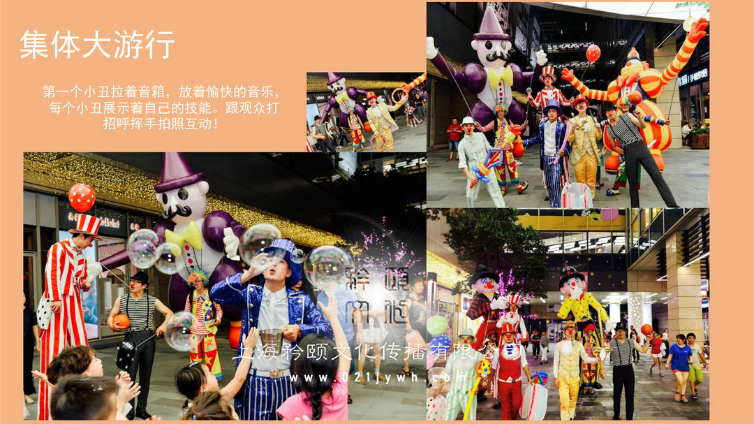 集體大游行第一個小丑拉著音箱,放著愉快的音樂,每個小丑展示著自己的技能。跟觀眾打招呼揮手拍照互動!