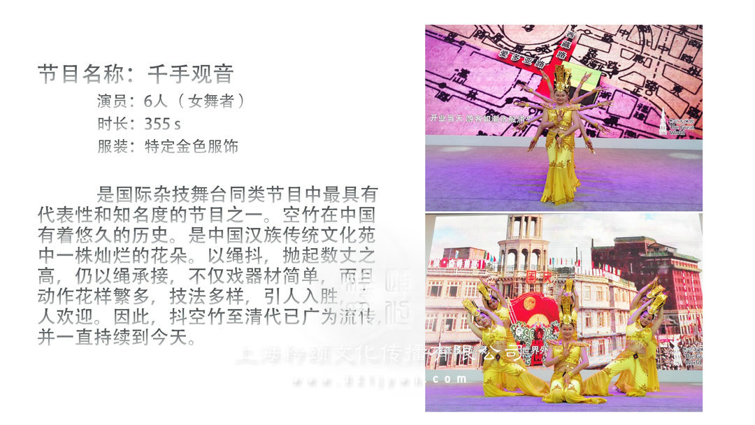 千手觀音是國際雜技舞臺同類節目中最具有代表性和知名度的節目之一??罩裨谥袊兄鴤骶玫臍v史。是中國漢族傳統文化茹中一株燦爛的萑朵。以繩抖,拋起數丈之高,仍以繩承接,不僅戲器材簡單,而且動作萑樣繁多,技法多樣,引人入勝,人歡迎。因此,抖空竹至清代已廣為流傳,并一直持續到今天。